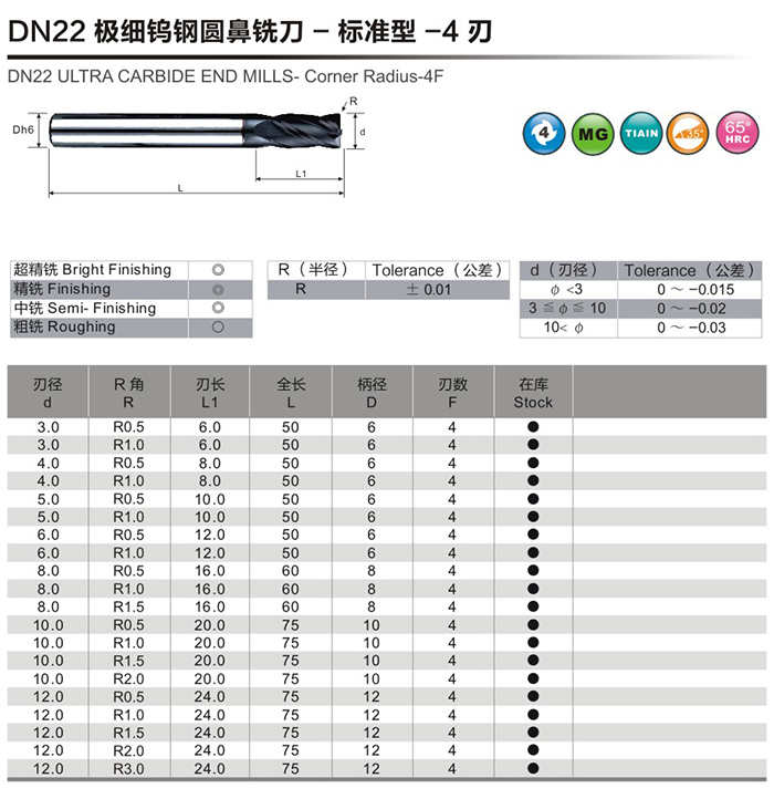DN22極細鎢鋼圓鼻銑刀-標準型-4刃